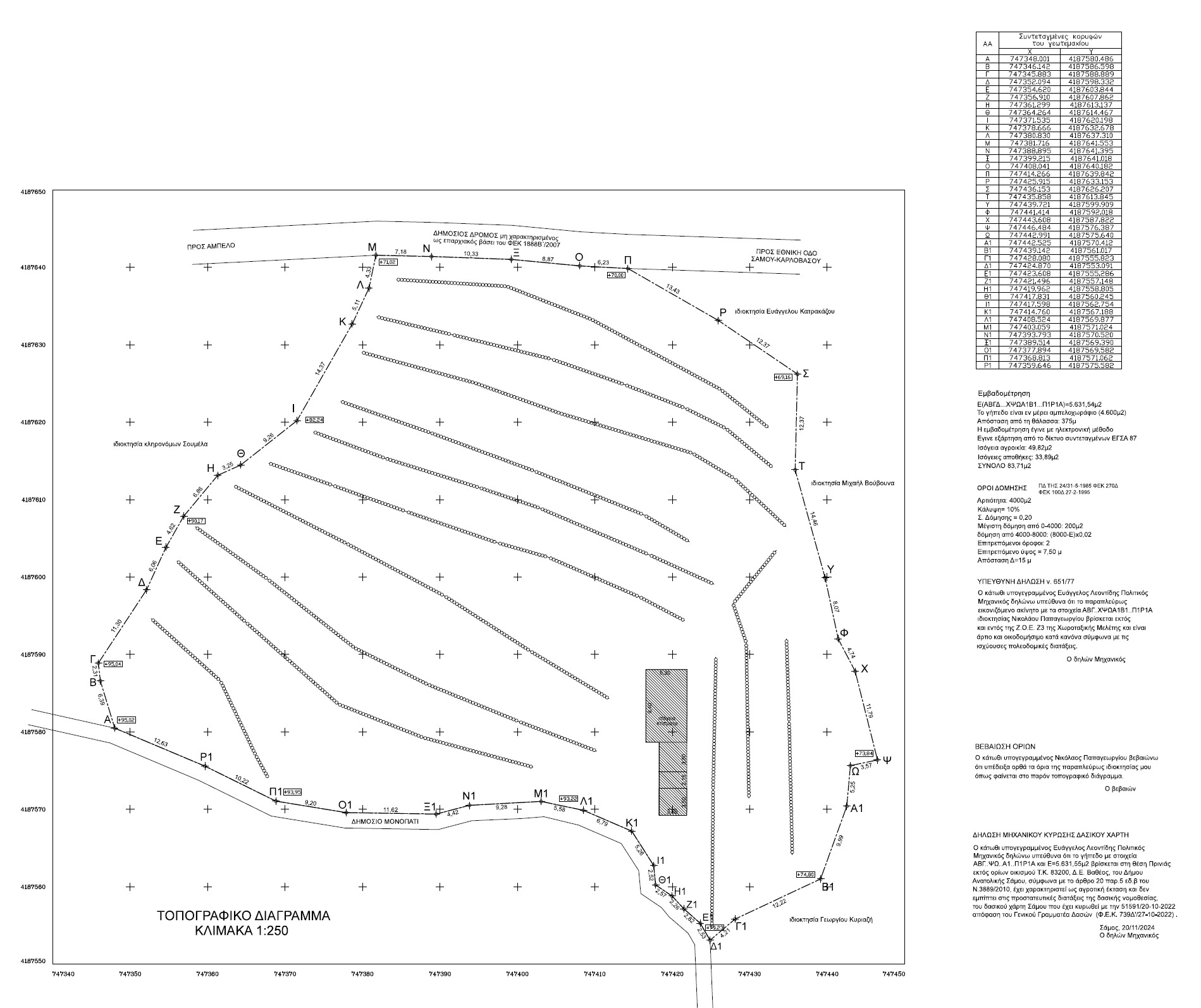 Το οικόπεδο είναι άρτιο και οικοδομήσιμο, εχει εμβαδόν στο σύνολο 5.631,54 τ.μ. εκ των οποίων τα 4.600 τ.μ. είναι αμπελώνας. Εχει υπόλοιπο δόμησης 149 τ.μ.